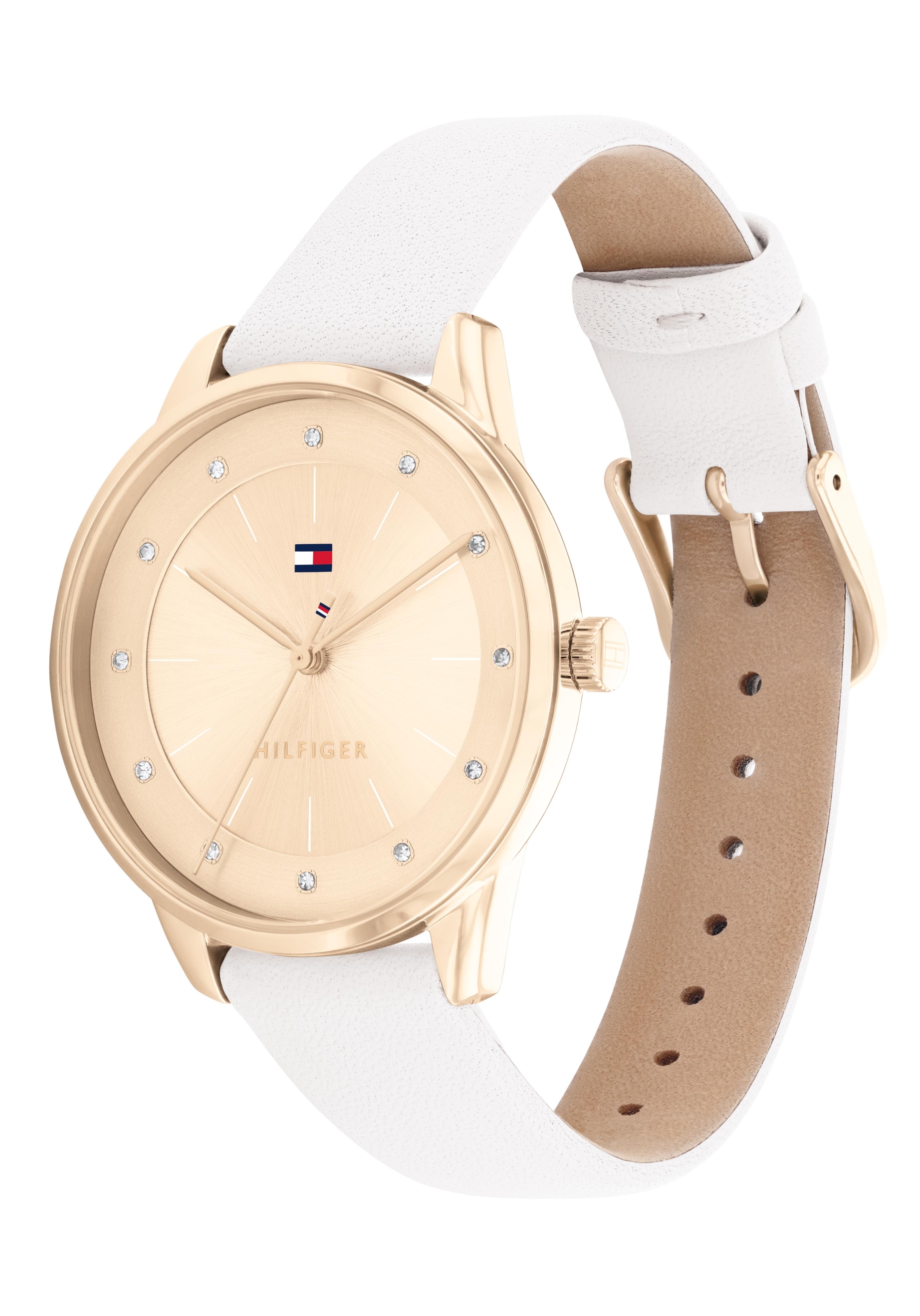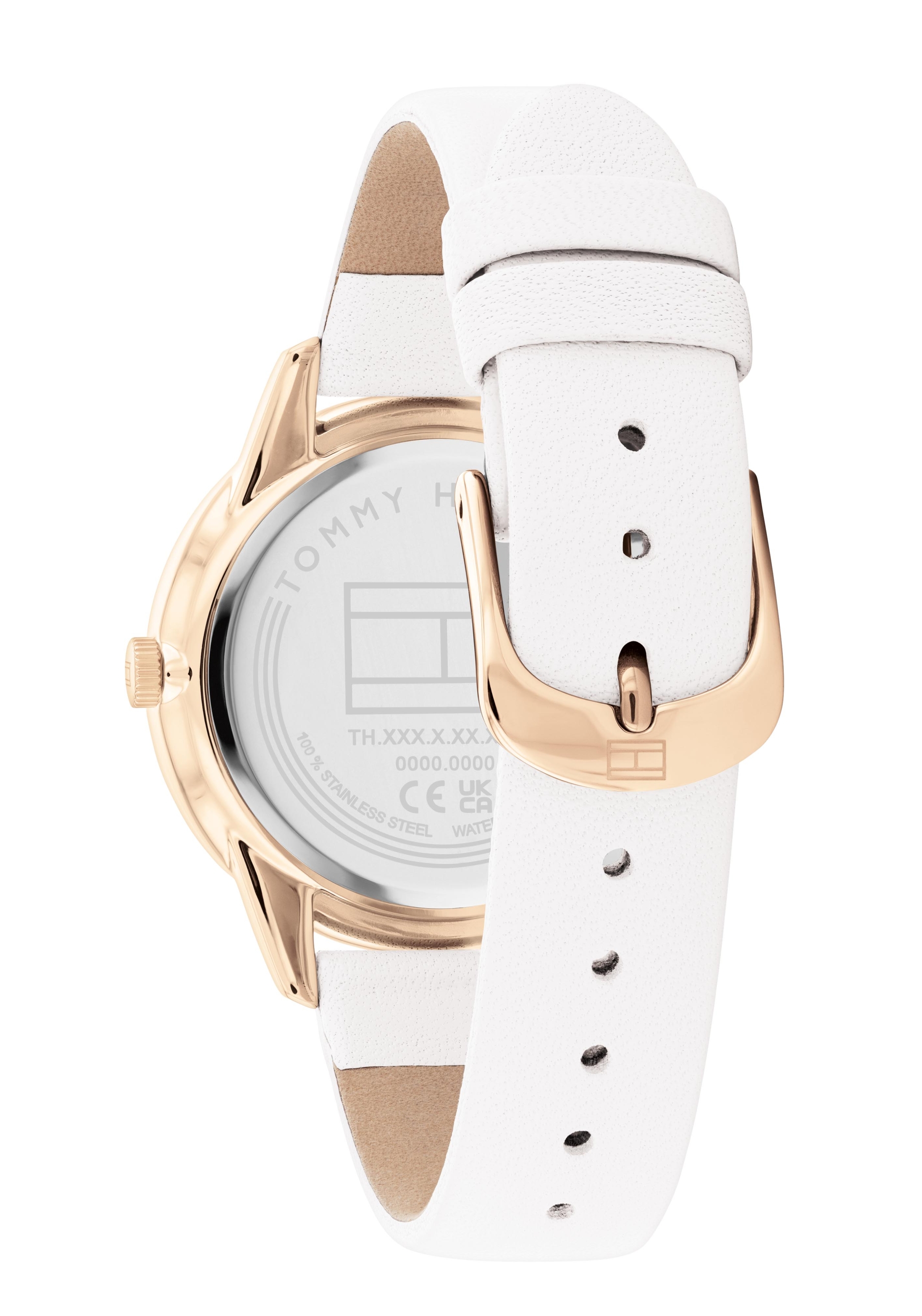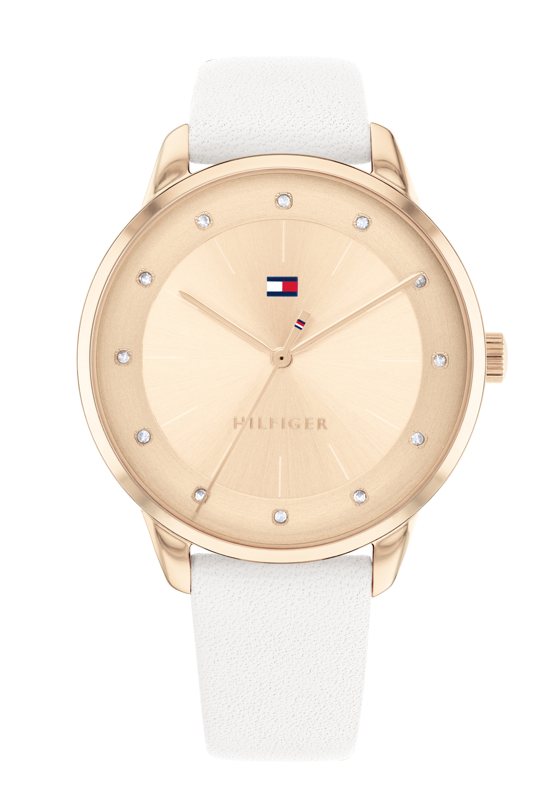 Auf dem roségold-farbenen Zifferblatt der Uhr befindet sich auf der zwölf Uhr Position das klassische Tommy Hilfiger Logo in den typischen Farben: dunkelblau, weiß und rot. Das Zifferblatt ist in einen lässigen inneren Sun-Ray Bereich und einem äußeren Ring. Auf diesem befinden sich statt Indexen oder Ziffern funkelnde Kristallsteinchen, die der Uhr einen glamourösen Look verleihen. Perfekt geeignet für eine späte Strandparty oder dem großen Auftritt im Nachtleben. Auch die Zeiger sind aus rosegold-farbenen beschichteten Edelstahl gefertigt, wobei sich die typischen Tommy Hilfiger Farben auch auf dem Sekundenzeiger wiederfinden. Ein kratzfestes Mineralglas schützt das Innenleben der Uhr vor äußeren Einflüssen. Ausgeliefert wird die Uhr an einem anschmiegsamen weißen Lederarmband mit integrierter rosegold-farbener Dornschliesse.