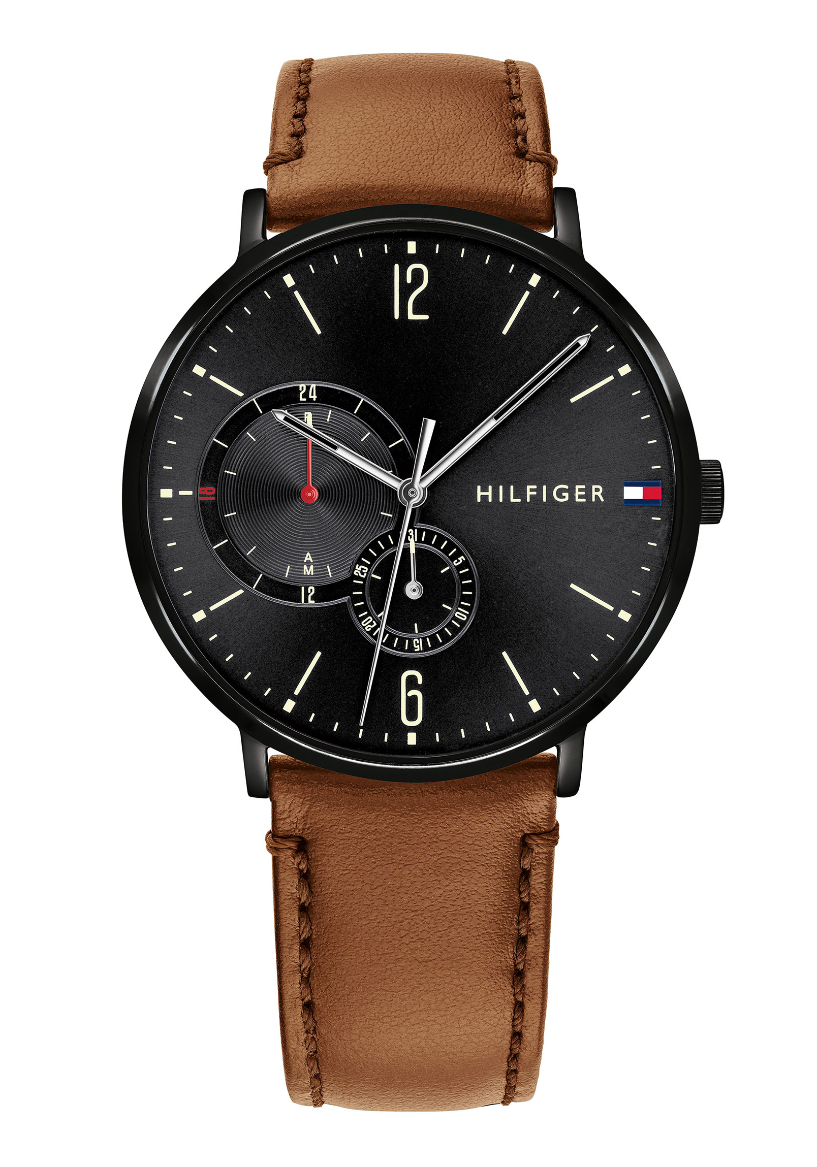 Auf dem schwarzen Zifferblatt befindet sich ein Tommy Hilfiger Logo.