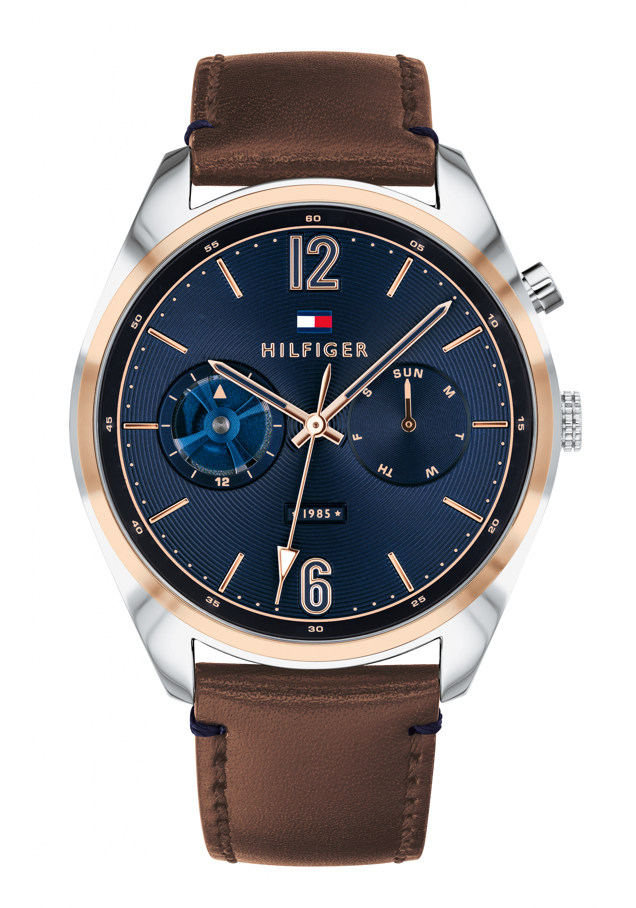 Auf dem blauen Zifferblatt befindet sich ein Tommy Hilfiger Logo.