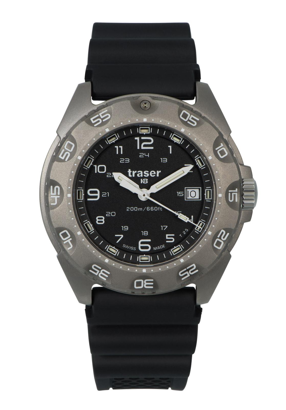 Auf dem schwarzen Zifferblatt befindet sich ein Traser H3 Logo.