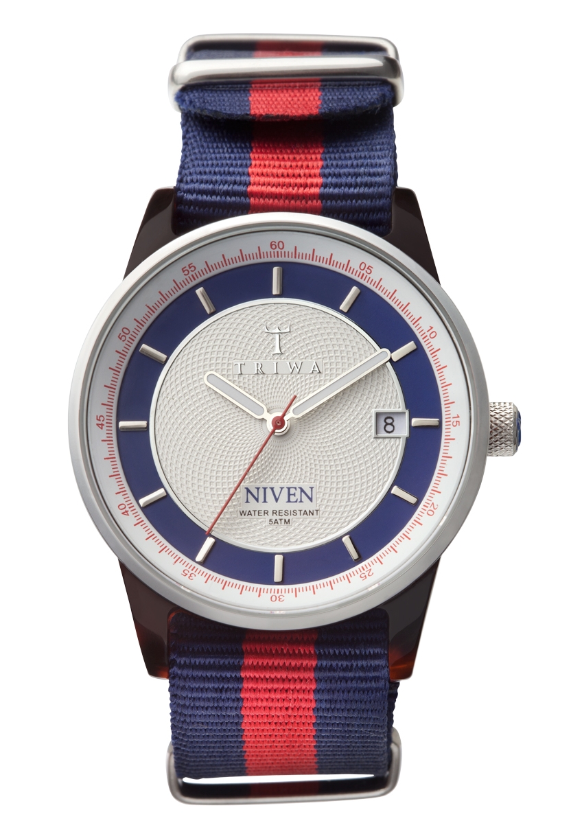 Das Nylonarmband ist blau und rot gestreift und hinterlegt das Gehäuse durchgehend, wodurch ein Austausch des Bandes ohne jegliche Werkzeuge durchgeführt werden kann.