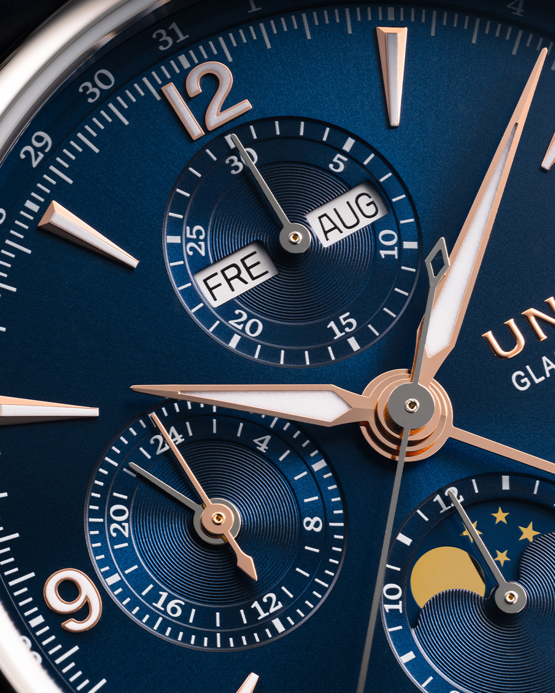 Im Zentrum steht die kunstvoll gestaltete Mondphasenanzeige, auf der ein goldener Mond vor einem dunkelblauen Firmament seine Bahn zieht. Auf dem äußeren Zifferblatt findet sich die Datumsanzeige, welche mittels zentral aufgesetzten Zeiger angezeigt wird.