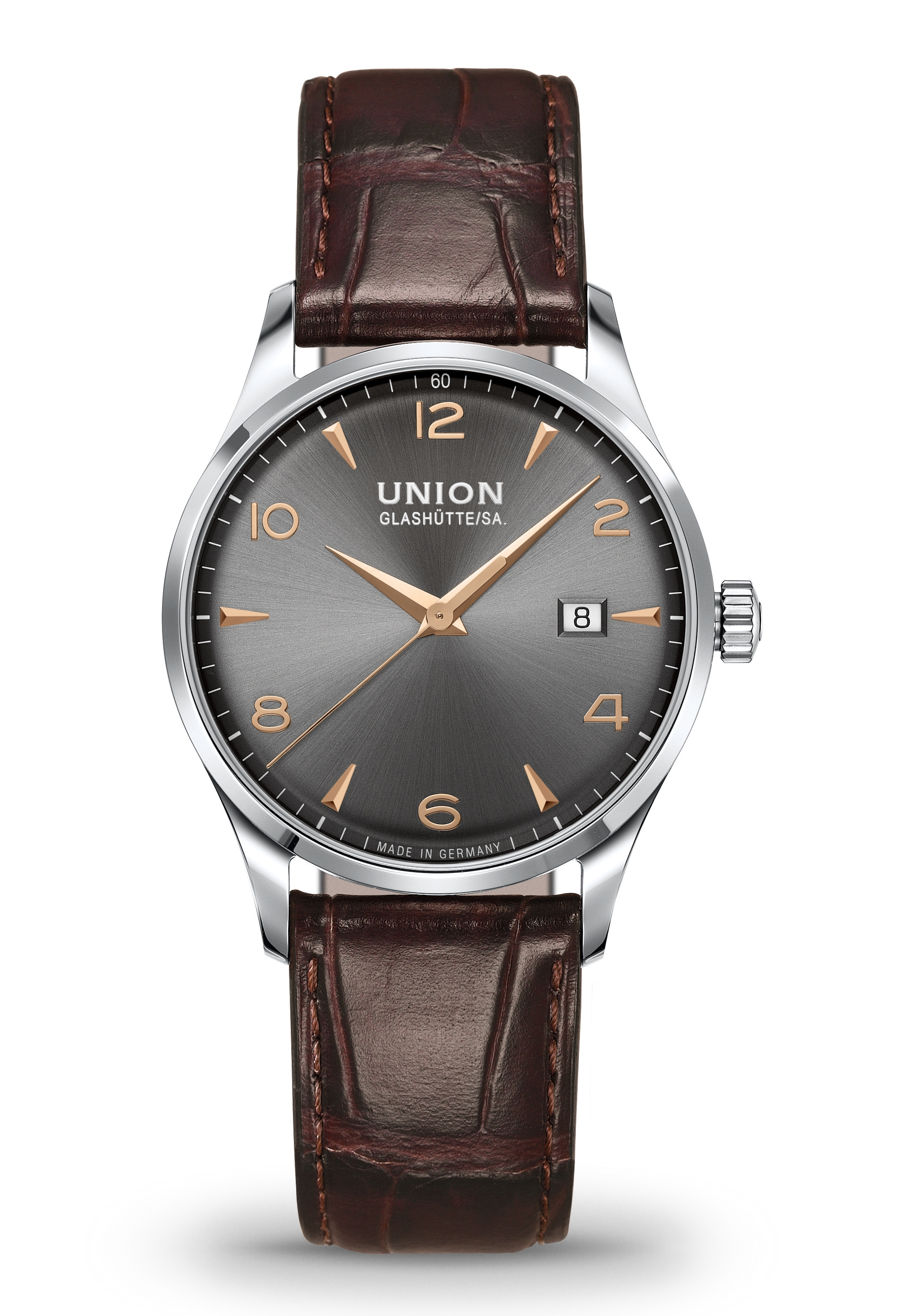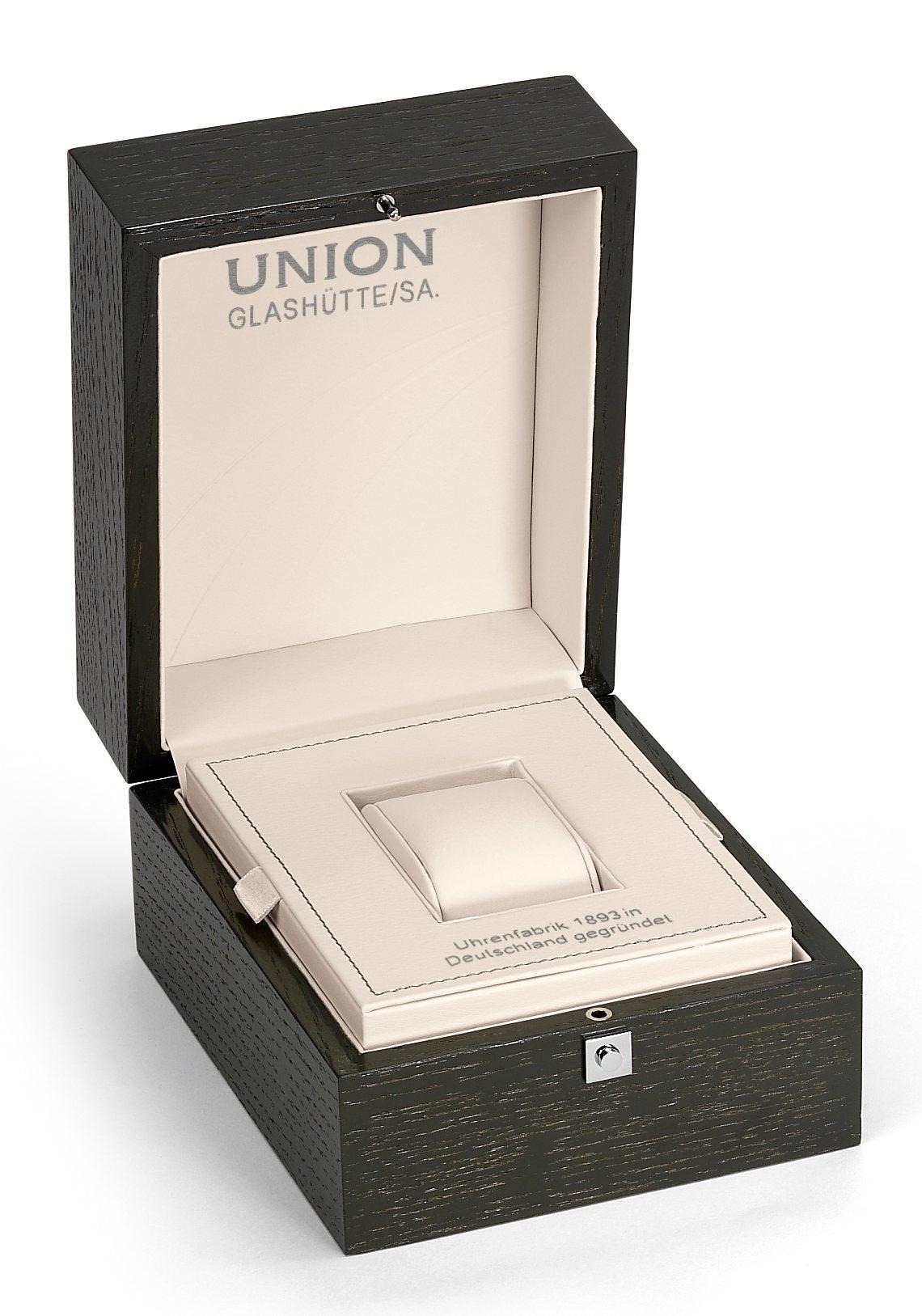 Auf dem formschönen, schwarz-schimmernden Zifferblatt befindet sich ein dezentes Union Glashütte S.A. Logo.