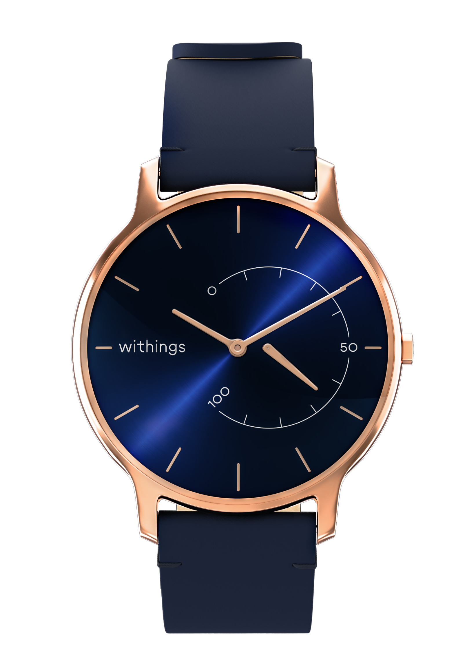 Die withings Move Timeless Chic ist eine schlicht-elegante Hybrid-Smartwatch mit GPS. Das roségoldfarbene Edelstahlgehäuse hat einen Durchmesser von 38 mm und ist bis 5 bar wasserdicht. Zusammen mit dem verbauten Mineralglas bietet es guten Schutz für das Innere der Uhr. Auf dem dunkelblauen Zifferblatt befinden sich zwei roségoldfarbene Zeiger und ein Totalisator mit roségoldfarbem Zeiger, der Aufschluss über den Fortschritt für das Schrittziel gibt.